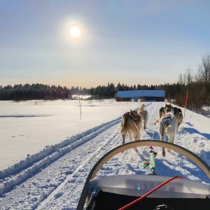 2. Arrivati al giardino degli husky, dove i cani stanno già abbaiando emozionati in attesa di partire. Inizialmente la guida professionale vi darà istruzioni di sicurezza e di guida, noi sempre al vostro seguito in caso di bisogno, dopodiché vi condurrà al punto di partenza, dove saranno pronti i cani e le slitte. Uno di voi guida la slitta, l’altro si siede nella slitta. È possibile cambiare la guida durante il viaggio. Il viaggio può iniziare! Attraverserai la foresta invernale, dove alberi coperti di neve e paludi tranquille sfrecciano davanti a te, mentre cani impazienti corrono davanti alla tua slitta. Lungo la strada c’è anche tempo per ammirare dei paesaggi belli e vari da godersi con la propria famiglia